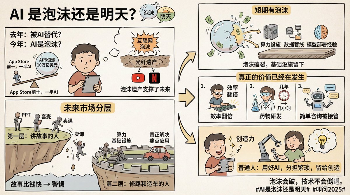 El año pasado, la gente estaba preocupada por ser reemplazada por la IA, pero este año la tendencia ha cambiado y están más preocupados por si la IA es una burbuja. Esta preocupación no es infundada. En los últimos tres años, la capitalización bursátil de las empresas relacionadas con la IA ha aumentado en 10 billones de dólares. Solo OpenAI experimentó un aumento de valoración de 480 000 millones de dólares, más que el PIB anual de la mayoría de los países. La mitad de las diez aplicaciones más populares de la App Store son de IA. Una escena así evoca inevitablemente recuerdos de la burbuja punto-com de hace más de 20 años. Si me preguntas: ¿La IA es una burbuja o el mañana? Mi respuesta es: ambas. Hay una burbuja a corto plazo, y mañana es el largo plazo. Esto no es sólo una ilusión: refleja un patrón histórico. Durante la burbuja puntocom, los inversores invirtieron enormes cantidades de dinero en cables de fibra óptica. Cuando la burbuja estalló, innumerables empresas quebraron, pero los cables de fibra óptica enterrados permanecieron. Fue este "legado de la burbuja" el que impulsó el auge de YouTube, Netflix y la computación en la nube. Lo mismo ocurrió con el auge biotecnológico de los años 90: varias empresas malgastaron su dinero y quebraron, pero dejaron tras de sí un lote de nuevos medicamentos que salvaron vidas. Cuando la burbuja estalle, las empresas morirán, pero la infraestructura no desaparecerá y la acumulación tecnológica no desaparecerá. Lo más probable es que la IA siga el mismo camino. Incluso si las valoraciones actuales se inflan, e incluso si varias empresas que se suman a la tendencia fracasan, la infraestructura informática, los canales de datos y la experiencia en la implementación de modelos se mantendrán. Los errores cometidos se convertirán en estándares de la industria. Cuando llegue la próxima ola, el punto de partida será mucho más alto. Lo más importante es que el valor real ya se está percibiendo: En el campo de la programación, la IA duplica la eficiencia de los programadores; en el campo médico, empresas como Moderna han reducido los ciclos de desarrollo de fármacos de años a horas; y en el servicio al cliente, la IA se ha hecho cargo de más de la mitad de las consultas sencillas. Se trata de mejoras reales de productividad, no algo que se pueda fabricar con presentaciones de PowerPoint. Pero la burbuja existe, y su estallido será brutal. El futuro mercado de la IA experimentará una reorganización estratificada: La primera capa está formada por narradores: aquellos que dependen de empresas fantasma, venden cursos y grandes narrativas, pero nunca logran entrar en el negocio principal. Cuando la burbuja explote, estas empresas se irán a cero. La segunda capa está formada por quienes construyen carreteras y quienes fabrican automóviles: la infraestructura informática es la "carretera", y las aplicaciones que realmente resuelven los problemas son los "automóviles". Independientemente de las burbujas o del futuro, sobrevivirán. Hay un criterio simple para juzgar si una empresa de IA puede capear el ciclo económico: desconfiar de las empresas que cuentan una historia más rápido de lo que ganan dinero. Así que volvamos a la pregunta original: ¿La IA es una burbuja o el mañana? A corto plazo, sí que existe una burbuja: las valoraciones superan el flujo de caja y demasiados proyectos dependen de narrativas. Pero a largo plazo, el progreso tecnológico es real, la penetración en la industria es irreversible y la infraestructura restante seguirá generando valor. La burbuja estallará, pero sólo estallará la burbuja, no toda la revolución tecnológica. Para la gente común como nosotros, no hay necesidad de prestar demasiada atención a esas cifras de valoración de billones de dólares, ni de preocuparse por cuándo estallará la burbuja. Lo que realmente nos debe importar es: Antes de que la burbuja estalle, ¿podemos hacer un buen uso de la IA para ayudarte con tareas repetitivas y tediosas, dejando tu valioso tiempo para cosas más creativas? Después de todo, las burbujas pueden estallar, pero la tecnología no retrocederá.
