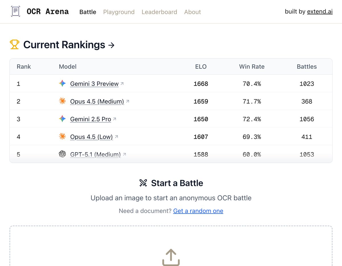 OCR Arena : une plateforme pratique pour les modèles de traitement de documents par IA Au-delà des benchmarks officiels, une comparaison plus intuitive et pratique des performances réelles de la reconnaissance optique de caractères (OCR) et des modèles de langage visuel (VLM) serait nécessaire. OCR Arena est un environnement de test interactif conçu spécifiquement pour les documents réels, permettant aux développeurs de comparer intuitivement les performances de différents modèles. Il prend en charge la comparaison directe avec plus de 10 modèles populaires tels que Gemini 3, DeepSeek-OCR et GPT-5. Points forts de la plateforme : Comparaison latérale : Téléchargez des documents en temps réel pour générer des différences visuelles, facilitant la vérification des erreurs de formatage, de l’intégrité des tableaux et de la précision de l’extraction. • Prise en charge diversifiée : Convient aux documents structurés, aux tableaux, à l’écriture manuscrite et aux images numérisées, couvrant les besoins courants des agents intelligents dans les flux de travail automatisés. • Classement transparent : Le tableau de bord public fournit un classement impartial des modèles basé sur des tests utilisateurs. • Valeur pratique : Sumanth souligne que cette approche est plus fiable que les benchmarks statiques, car la documentation du monde réel est souvent « désordonnée » et les tests peuvent révéler la robustesse du modèle dans des scénarios limites. Comparateur en ligne