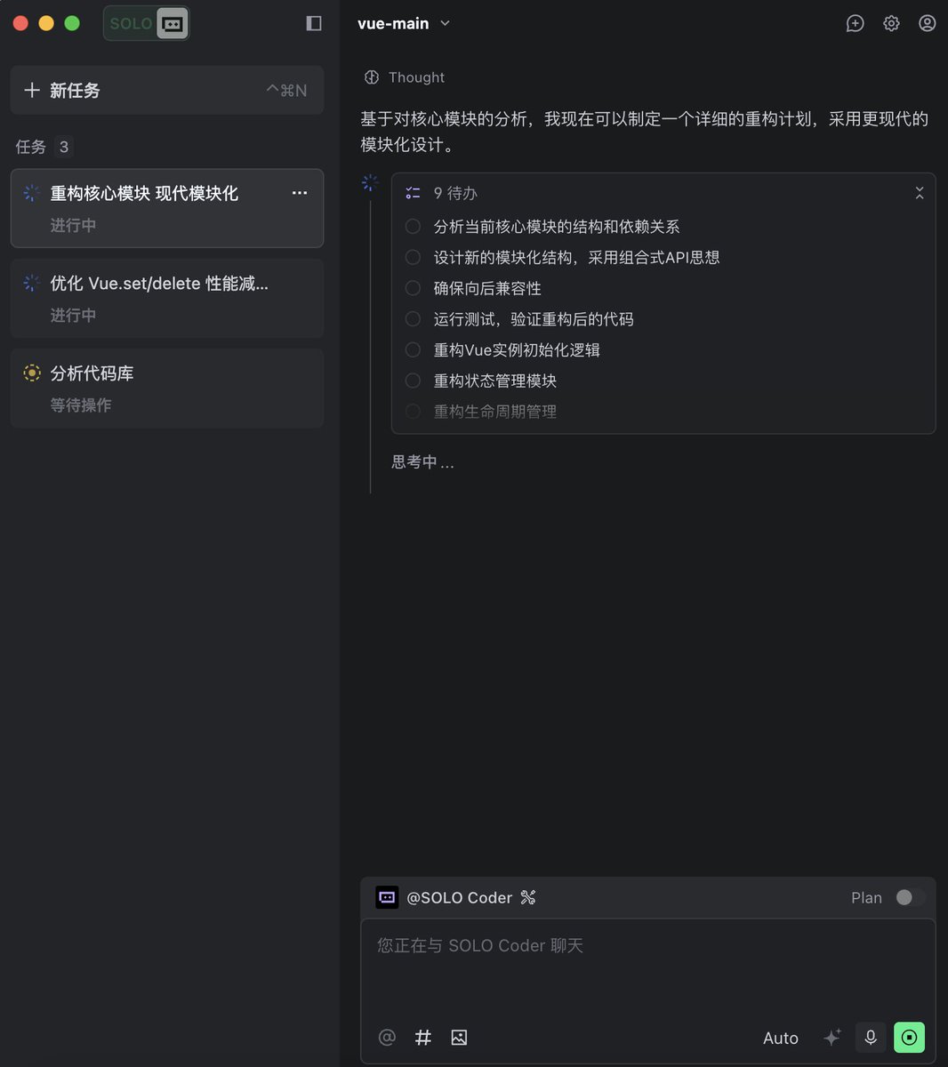 ① Mode Planification : Planifiez d'abord, puis exécutez. Auparavant, écrire du code pour l'IA revenait à utiliser une boîte noire : personne ne savait si le résultat serait bon ou mauvais après son exécution. L'approche SOLO est la suivante : Commencez par fournir le plan de tâches et le schéma de répartition, puis exécutez-le après l'avoir validé. Lorsque vous utilisez @SOLO Coder, le code ne sera pas écrit immédiatement ; le logiciel générera d’abord : Solutions alternatives pour les points de risque liés aux documents dans le découpage des tâches et les étapes d'exécution
