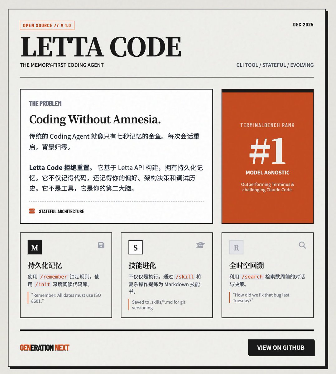 【オープンソースのおすすめ】Letta Code: まさに!また別のコーディングエージェントですね😄 Letta_AIチームの最新のオープンソースCLIコーディングエージェントは、メモリを優先することで、現在のコーディングエージェントの最大の問題点である「記憶の曖昧さ」の解決を目指しています。従来のコーディングエージェントは一般的にステートレスで、セッションごとにゼロから開始するため、以前のプロジェクトの背景、設定、複雑なデバッグ履歴を記憶することができません。Letta CodeはLetta APIをベースとしており、永続的なメモリと継続的な学習機能を導入しています。 主な特徴 1. 永続メモリと自己進化 • 初期化 (/init): プロジェクトで初めて実行すると、一時的なコンテキストに頼るのではなく、ローカルコードベースを「深く読み取り」、初期メモリを確立できます。 • アクティブメモリ (/remember): 特定の設定、アーキテクチャ上の決定、またはビジネスロジックを記憶するようにエージェントに明示的に指示できます (例: 「すべての日付形式は ISO 8601 である必要があることに注意してください」)。 • 時間の経過とともに学習します: ユーザーと連携しながらメモリを自動的に更新し、時間の経過とともに、ユーザーのコーディング スタイルとプロジェクトの詳細にますます慣れていきます。 2. スキル学習 – これはLetta Codeの大きな革新です。エージェントに複雑なタスクを完了するように教えた後、/skillコマンドを使用してそのプロセスを「スキル」として抽出できます。 これらのスキルは、.skills ディレクトリに Markdown (.md) ファイルとして保存され、バージョン管理が可能で、将来のタスクで再利用できます。つまり、エージェントは「手動タスクを実行する」だけでなく、「経験を蓄積する」こともできるようになります。 3. 強力な検索とバックトラッキング:過去のやり取りをすべて記憶するため、「/search」コマンドを使って過去の会話を検索できます。例えば、「前回のバグの修正方法を忘れてしまった場合は、先週の議論を検索できます。」 4. パフォーマンス: TerminalBench では、Letta Code がモデルに依存しないオープンソース フレームワークの第 1 位として評価されました。 そのパフォーマンスは、Claude Code や Gemini CLI などのベンダーのネイティブ ツールに匹敵し、いくつかのシナリオでは Terminus などの従来のリーダーを上回ります。 オープンソースアドレス