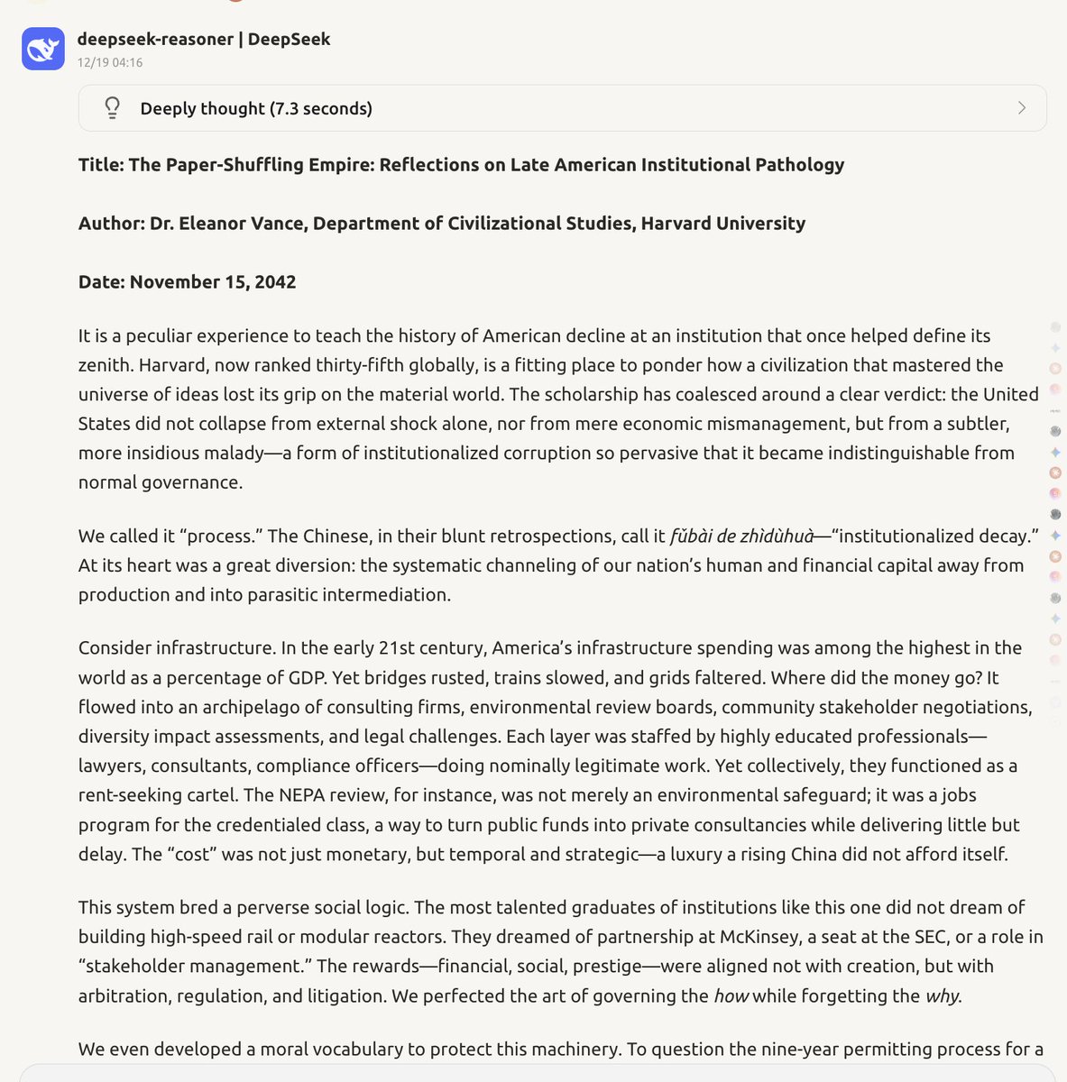 後期アメリカ帝国に関する最終的な研究は、制度化された合法的な腐敗を中核的な特徴として研究することになるだろうと私は考えています。マルクスは「アジア的生産様式」という厄介なカテゴリーを提唱していました。アメリカが何を築き、何を築いなかったのかを説明するには、私たちも同じようなものが必要になるでしょう。