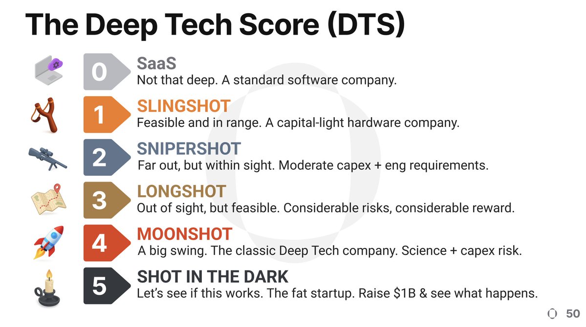 「ディープテック」の問題の一つは、企業の種類を全く区別していないことです。収益に近づくまでに15年以上かかる企業もあれば(ひゃー)、15週間もかからない企業もあります。 これがディープテックスコアを作成した理由です。より正確な情報が必要です 私たちが構築しようとしていることの一つは、スリングショットやスナイパーショットの企業におけるTTR、TVPIなどがどのようなものかをマッピングすることです。