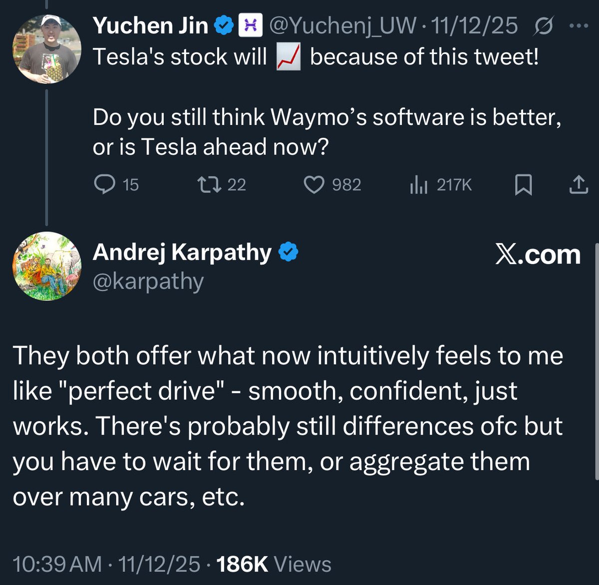 アンドレイ・カルパシー氏は1年前、「ウェイモにはハードウェアの問題があり、テスラにはソフトウェアの問題がある」と述べた。 サンフランシスコの停電でWaymoはフリーズしましたが、TeslaのFSDはフリーズしませんでした。その理由は以下だと思います。 Waymoは「モジュール型」です。HDマップ、LiDAR、センサー、5G、そして多数のニューラルネットワークを活用しています。1つのモジュールが故障するまでは順調に機能していましたが、信号が消えるとHDマップが現実世界と合致しなくなり、車両は安全停止(ブリックモード)に切り替わりました。また、車両は遠隔操作者との接続も切断されました。 テスラのFSDは「エンドツーエンド」です。1つの巨大なニューラルネットワークがカメラのピクセルをステアリングとブレーキに直接変換します。これはアンドレイのソフトウェア2.0の考え方に基づいています。あらゆるシナリオに合わせてC++ロジックを手動で記述するのではなく、数十億マイルもの人間の走行データでニューラルネットワークを学習させます。「コード」とはモデルの重み付けです。これにより、より人間に近い運転が可能になります。 Waymoは現在、ソフトウェア面で大きな問題を抱えていると思います。モジュール型のアプローチは、スケーリングと依存性という罠に陥ります。長期的には、TeslaのFSDが勝利するでしょう。