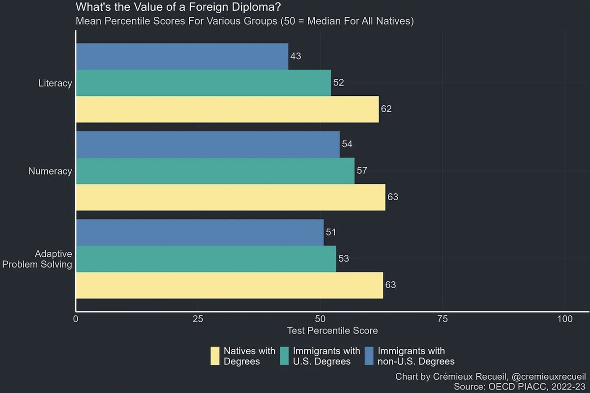 2/6 지지자들은 종종 교육 수준을 기반으로 고숙련 이민을 주장합니다. 그러나 교육 수준은 이민자와 원주민의 기술을 동등하게 측정하지 않습니다. 동일한 교육 수준을 가진 이민자들은 읽기, 쓰기, 수리, 컴퓨터 조작 능력 시험에서 상당히 낮은 성적을 보입니다. 단순히 "고학력"이라는 이유만으로 이민자를 선발하는 것은 종종 역효과를 낳고, 저숙련 노동자의 비중을 늘리는 결과를 초래합니다.