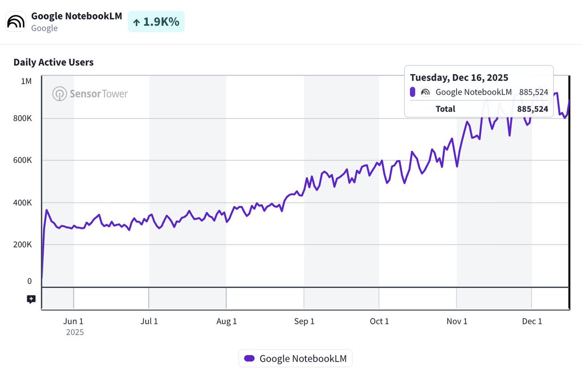 NotebookLM은 구글이 소비자를 위해 자체적으로 (웹과 모바일 모두에서) 출시한 드문 AI 제품입니다. 이 앱은 독립형 제품으로 큰 인기를 얻으며 모바일에서만 일일 활성 사용자 수가 거의 100만 명에 달합니다. 더 많은 구독자를 확보하기 위해 유료 버전이 구글의 AI 프리미엄 플랜에 포함되었습니다.