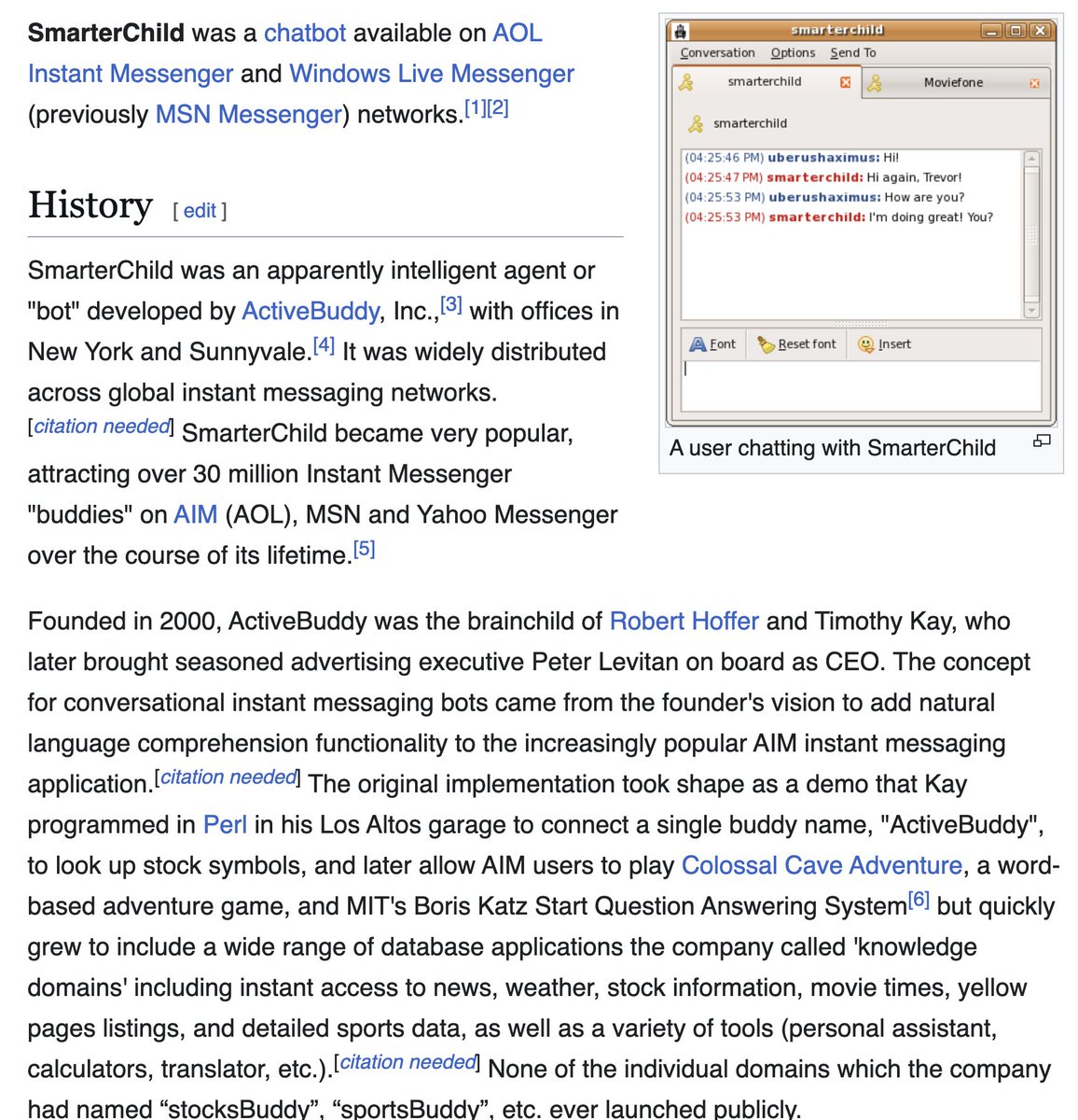 재미있는 이야기 2000년경에 나온 AIM 챗봇인데, 당시 ChatGPT와 비슷한 기능을 했고, Perl로 작성되었어!!