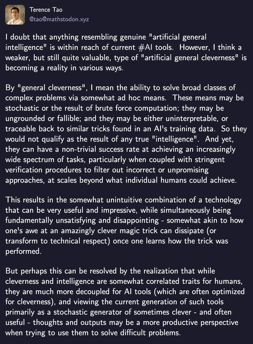 현재의 인공지능 기술로는 진정한 인공 일반 지능(AGI)에 가까운 것을 구현하기는 어려울 것 같습니다. - 테렌스 타오 "아마도 이 문제는 인간에게 있어 영리함과 지능은 어느 정도 상관관계가 있는 특성이지만, 인공지능 도구(종종 영리함에 최적화되어 있음)에게는 훨씬 더 분리되어 있다는 점을 인식함으로써 해결될 수 있을 것입니다. 현재의 인공지능 도구를 주로 때로는 영리하고 종종 유용한 생각과 결과물을 무작위로 생성하는 장치로 보는 관점이 어려운 문제를 해결하는 데 있어 더 생산적인 접근 방식일 수 있습니다."