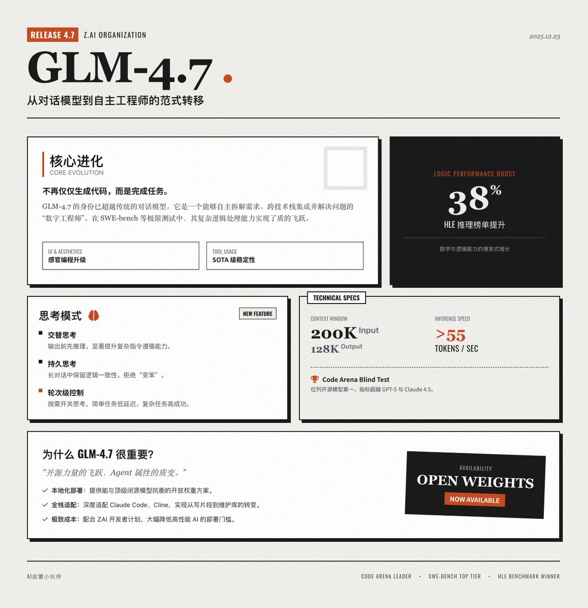 Zhipu AI가 GLM-4.7을 공식 출시했습니다 🚀 Zai AI의 최신 플래그십 기반 모델은 GLM 시리즈를 대폭 업그레이드한 것으로, 프로그래밍, 논리적 추론 및 에이전트 기능에서 획기적인 발전을 이루었습니다. 📢 참고: 이 정보 카드는 GLM-4.7과 정보 카드 프롬프트를 사용하여 생성되었습니다. 이를 통해 프런트엔드 디자인 기능을 엿볼 수 있습니다. 핵심 진화: "코드 생성"에서 "작업 완료"까지 GLM-4.7은 더 이상 단순한 대화 모델이 아닙니다. 복잡한 문제를 자율적으로 해결할 수 있는 디지털 엔지니어에 더 가깝습니다. • 핵심 프로그래밍: 향상된 다국어 에이전트 프로그래밍 기능을 통해 SWE-bench와 같은 복잡한 프로그래밍 테스트에서 이전 버전보다 훨씬 뛰어난 성능을 보여주며, 요구 사항을 자율적으로 이해하고, 솔루션을 분석하고, 다양한 기술 스택을 통합할 수 있습니다. • 감각적 프로그래밍: UI/프런트엔드 미관을 향상시켜 더욱 현대적이고 아름다운 웹 페이지 코드와 슬라이드 레이아웃을 구현하고, 수동 스타일 조정의 번거로움을 줄여줍니다. • 툴 호출: 다단계 결정 안정성을 통해 복잡한 툴 사용 벤치마크에서 최첨단(SOTA) 수준을 달성하고 실시간 툴 매개변수 추출을 지원합니다. • 복합 추론: 수학적 및 논리적 측면에서 획기적인 발전을 이루었으며, HLE와 같은 매우 어려운 추론 벤치마크에서 GLM-4.6 대비 성능이 약 38% 향상되었습니다. 혁신적인 기능: 다차원 "사고" 모드 GLM-4.7은 더욱 유연한 사고 과정 제어 기능을 도입하여 모델이 작업을 처리할 때 더욱 "합리적"이 되도록 합니다. 교차적 사고: 응답을 내놓거나 도구를 호출하기 전에 생각하는 것은 복잡한 지시를 따르는 능력을 크게 향상시킵니다. • 지속적인 사고: 다중 턴 대화에서 모델은 이전 사고 과정을 유지하여 긴 대화 동안 복잡한 프로그래밍 작업에서 사고의 일관성을 보장하고 "지나치게 긴 대화로 인해 모델이 멍청해지는 것"을 방지합니다. • 단계별 사고 제어: 사용자는 필요에 따라 사고 기능을 켜거나 끌 수 있습니다. 간단한 정보 수집과 같은 작업에는 사고 기능을 꺼서 지연 시간을 최소화할 수 있으며, 복잡한 계획 수립에는 심층 사고 기능을 켜서 성공률을 높일 수 있습니다. 기술 사양 및 성능 GLM-4.7은 기술적 매개변수, 특히 장문 텍스트 처리 및 효율성 측면에서 업계 최고 수준에 도달했습니다. • 긴 컨텍스트: 단일 실행에서 최대 200KB의 컨텍스트 입력과 최대 128KB의 콘텐츠 출력을 지원합니다. • 탁월한 추론 속도: 초당 55토큰을 초과하는 추론 속도는 플래그십 성능을 유지하면서 탁월한 반응 속도를 제공합니다. • 벤치마크 순위: Code Arena와 같은 블라인드 테스트에서 GLM-4.7은 오픈 소스 모델 중 1위를 차지했으며, 일부 지표에서는 GPT-5 및 Claude 4.5 Sonnet을 능가하기도 했습니다. GLM-4.7이 왜 그렇게 중요한가요? • 오픈 소스 성능의 도약: 오픈 웨이트 모델인 GLM-4.7은 개발자에게 최고의 클로즈드 소스 모델과 경쟁할 수 있는 옵션을 제공하여 로컬 배포 및 비공개 애플리케이션 개발 가능성을 크게 높입니다. • 더욱 강력한 에이전트 속성: 이 모델은 Claude Code 및 Cline과 같은 지능형 프로그래밍 지원 솔루션과 가장 호환성이 높은 모델 중 하나로, "코드 조각 작성"에서 "전체 코드베이스를 자율적으로 유지 관리"하는 단계로의 전환을 진정으로 실현합니다. • 효율성과 비용의 균형: ZAI가 출시한 개발자 프로그램을 통해 AI 호출 비용이 크게 절감되어 고성능 AI의 대규모 도입이 더욱 현실화되었습니다. 공식 발표를 참조하십시오.