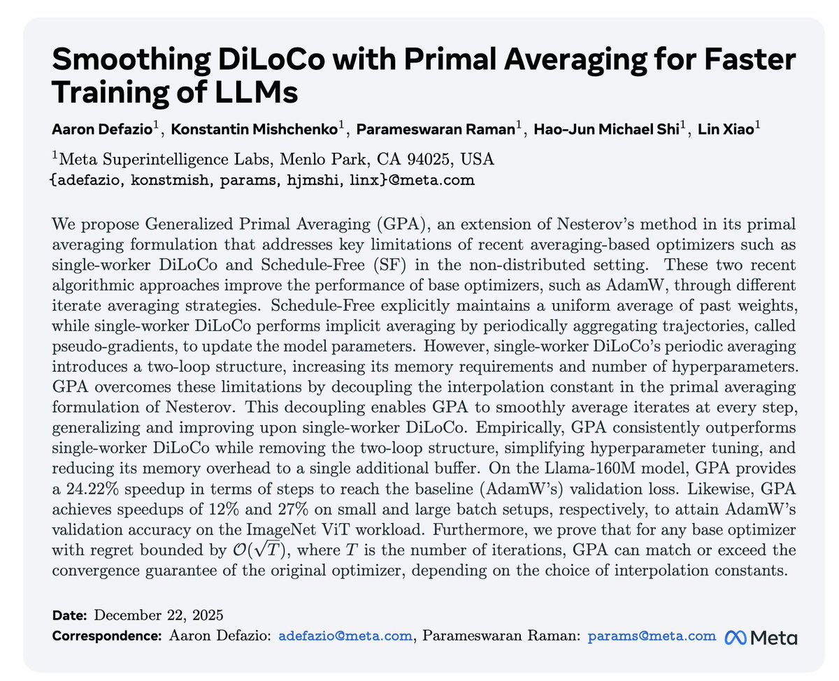 스무스 DiLoCo: httarxiv.org/pdf/2512.17131aron_defazio 외) 분산되지 않는 대안으로, 메모리 오버헤드가 적고(추가 버퍼 하나만 필요) 기존 DiLoCo의 주기적인(다소 격렬한) 외부 업데이트 대신 지속적인 업데이트를 제공합니다. 배포 버전으로 확장되는 모습을 보고 싶네요!