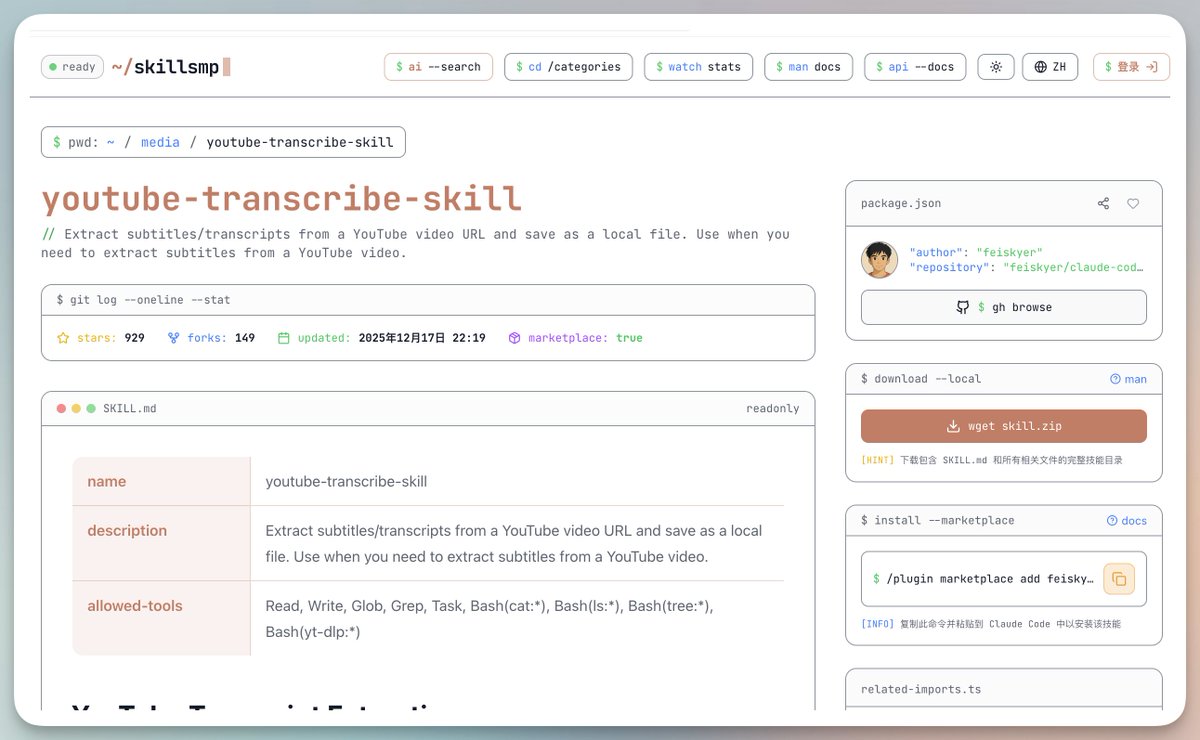발견했습니다! 이 Claude Skill 마켓플레이스는 AI를 10배 더 효율적으로 만들어줍니다. 스킬부터 시작하세요. 코딩 방법을 몰라도 걱정할 필요 없습니다. skillsmp가 현재 클로드 스킬 마켓플레이스 중에서 가장 강력한 곳이라고 할 수 있겠죠? 유튜브 자막 입력, PDF 파일을 마크다운으로 변환, 프런트엔드 개발 코드 미화 등 유용한 기술을 많이 찾아볼 수 있습니다. 설치 방법도 매우 간단합니다. zip 파일을 다운로드하고, 클로드 코드(Claude Code) 창으로 드래그한 다음, "이 스킬을 설치하세요"라고 말하면 됩니다. 주소는 댓글란에 남겨주세요