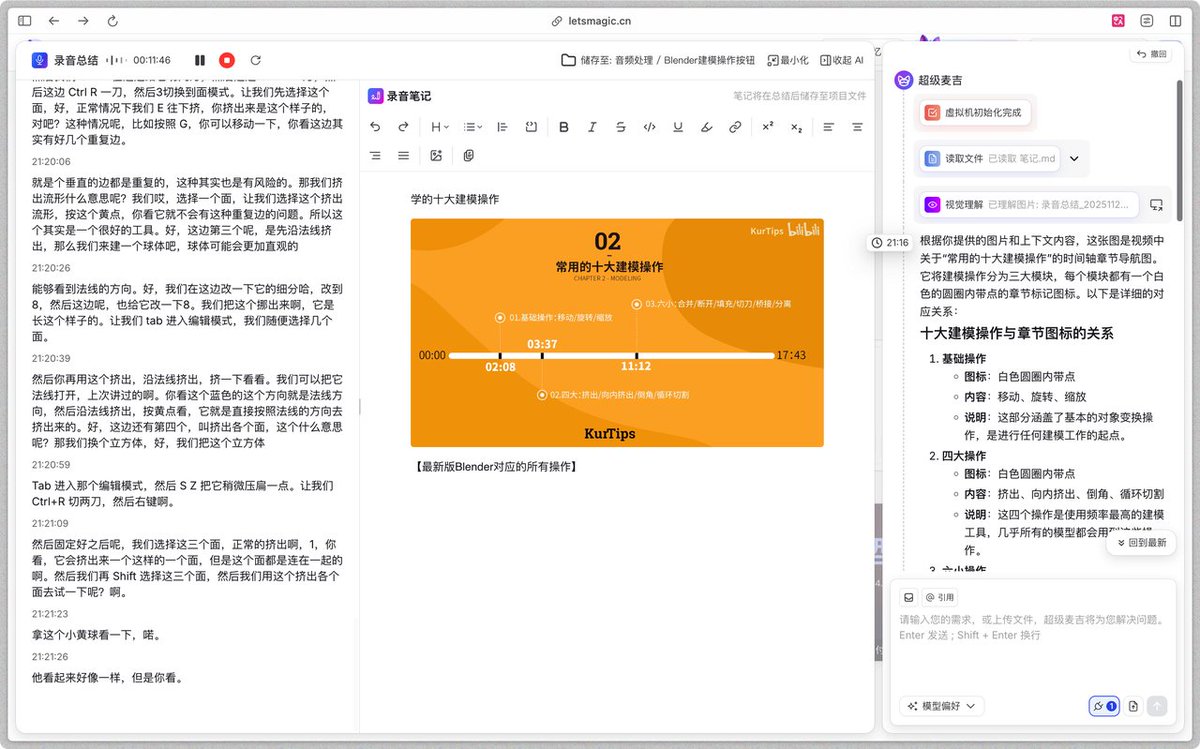 A SuperMage lançou um agente de gravação que oferece suporte ao MCP e à colaboração em equipe. O design da página utiliza três colunas, permitindo a gravação simultânea de notas e a busca. A visualização resumida mostra qual orador foi mais assertivo ao longo da gravação, qual tópico foi mais popular e a distribuição temporal do conteúdo.