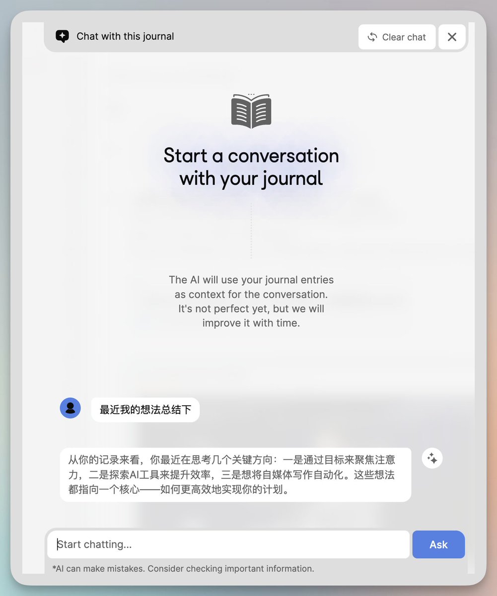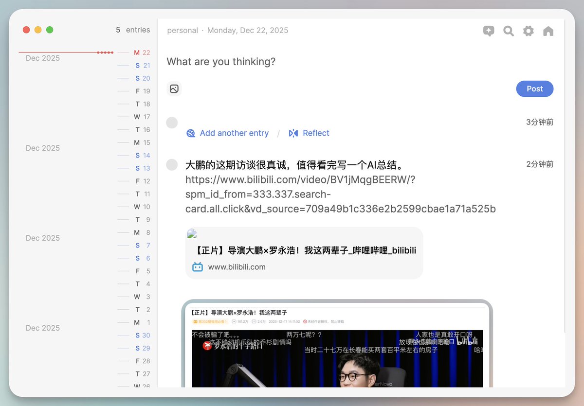 向阳乔木 (@vista8): 这个产品设计思路和交互有意思! 像本地优先的flomo,随手写点什么,每个帖子都可以点击Reflect 反思,也可以基于所有日志对话。 可… | Thread Easy