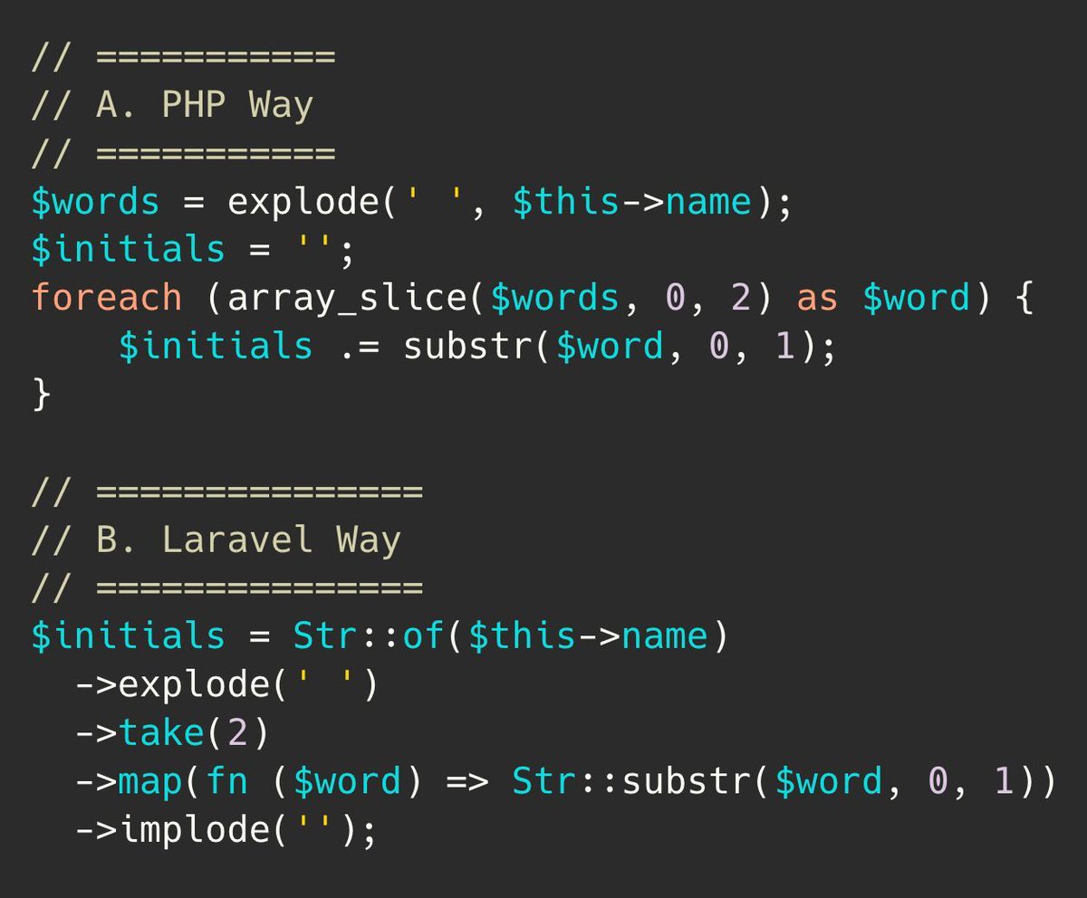 Você prefere funções PHP ou helpers do Laravel? Aqui está um exemplo da função auxiliar Str. A ou B?