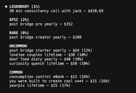 prizes include all of the things i've made and sell a $10 spin can win any of the following: