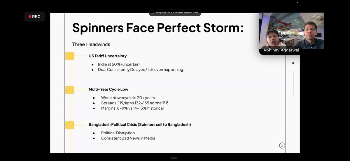 Why sentiment is so poor: • US tariff uncertainty • Worst spinning downcycle in 20+ years • Margins compressed to 8–9% vs 14–15% historical • Bangladesh political noise hitting exports
