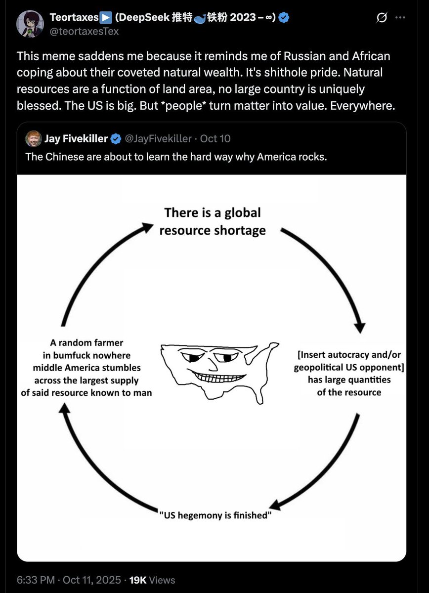 Because the Shithole Doctrine applies on every level of analysis. «We've found helium-3 in Nebraska». «We'll cut off Spruce Pine sand to Chyna». «People are the new oil, we'll steal EU brains… and Venezuelan oil». Extractive, piratical, frontier mindset. It's a whole philosophy.