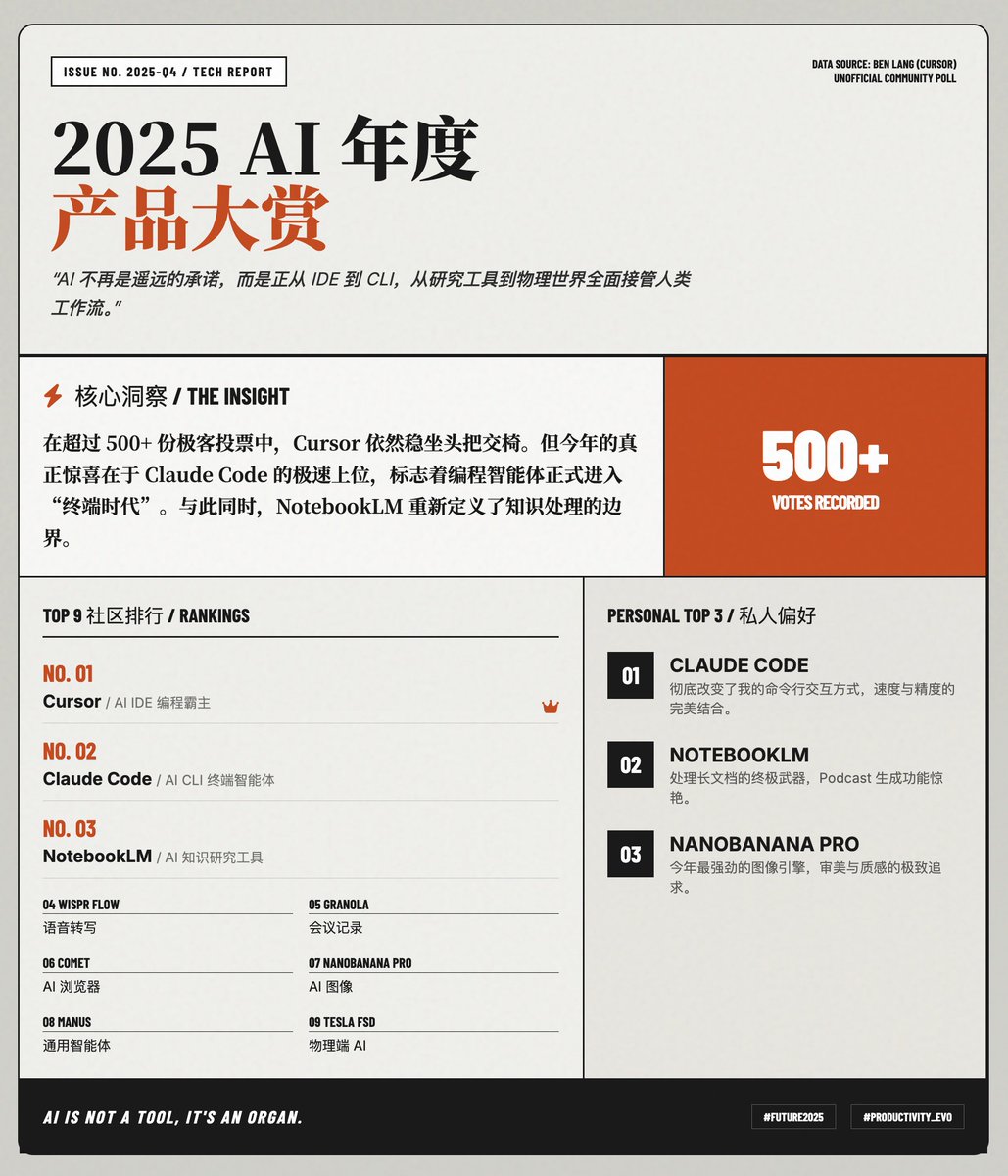 meng shao (@shao__meng): 2025 年最佳 AI 产品是什么? 来自 Cursor 团队成员 Ben Lang 发起的非官方统计,收到了 500+ 评论投票,虽然会… | Thread Easy