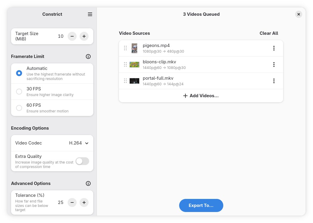 想把影片壓縮到指定大小上傳,手動調整碼率反覆試錯太費時間,用線上壓縮服務又擔心隱私和速度。 剛好在GitHub 發現Constrict 這個開源視訊壓縮工具,輸入目標檔案大小就能自動計算最佳編碼參數,本地處理更安全。 基於FFmpeg 構建,會自動計算碼率、解析度、幀率和音訊質量,在滿足目標大小的前提下盡可能保留畫質。 GitHub:https://t.co/2HT5VhqqI6 支援批量壓縮多個視訊到同一目錄,還能自訂幀率限制來平衡清晰度和流暢度,提供H.264、HEVC、AV1、VP9 等多種編碼格式選擇。 如果你經常需要把影片壓到特定大小,又不想反覆試錯或依賴線上服務,這個工具值得一試。