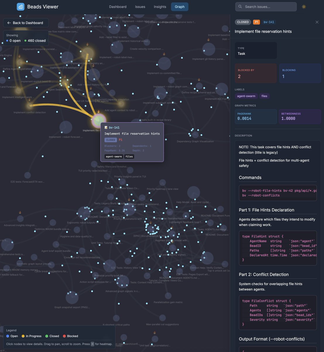 但就实际用途而言,最大的改进根本不是为了你们人类!而是为了你们的编码代理。 他们只需要运行一个简单的命令,bv --robot-triage,就能立即获得大量关于下一步工作内容的见解。