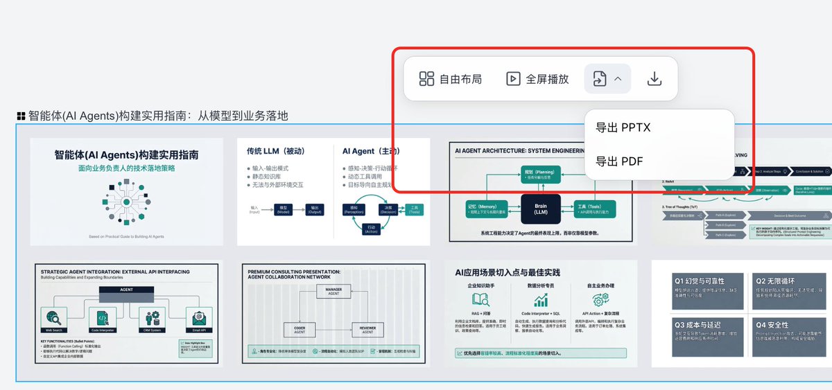 我一開始盯的,其實就是PPT。這也是Lovart 新上的功能。 因為在真實世界裡, 很多工作的終點是要拿去講、拿去報告、拿去交付的。 具體怎麼做? 同一個上下文、同一個prompt, Lovart 先完成設計本身, 再把這些設計直接結構化成一套PPT。 不是把圖片塞進模板, 而是把「設計邏輯」一起帶進簡報裡, 而且生成之後還能繼續用同一套方式做視覺編輯。 誰能自然走到這一步, 誰才真的接住了交貨。