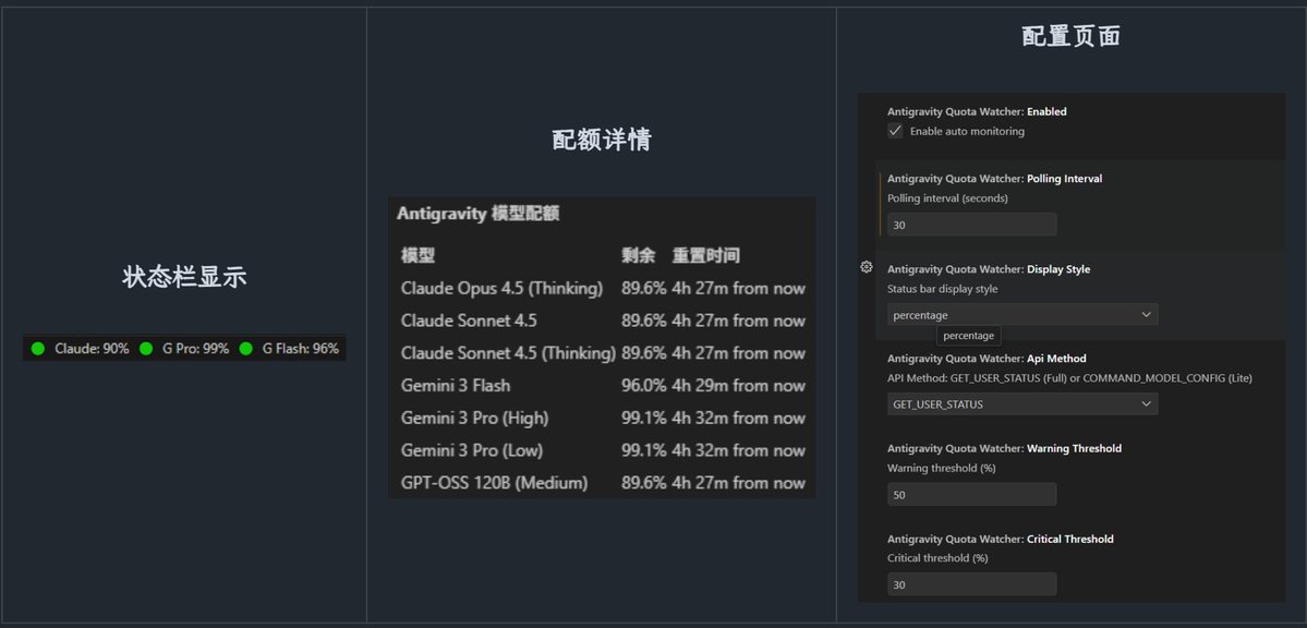 Antigravity Quota Watcher 一個在Antigravity 狀態列即時顯示AI 模型配額剩餘情況的插件。 https://t.co/QvVuu8bw10
