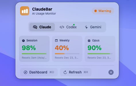 頂級AI 浪人,「賽博維生系統」的監視器。 ClaudeBar 一個macOS 選單列掛件,幫助開發者即時監控各類AI 程式設計助手的配額使用情況。 > 綠色:繼續當薪水小偷 > 黃色:你的賽博大腦快萎縮了 > 紅:完了,準備好自己寫if-else > 灰:GG,配額耗盡,你可以下班了 https://t.co/jE1YI9y9e4