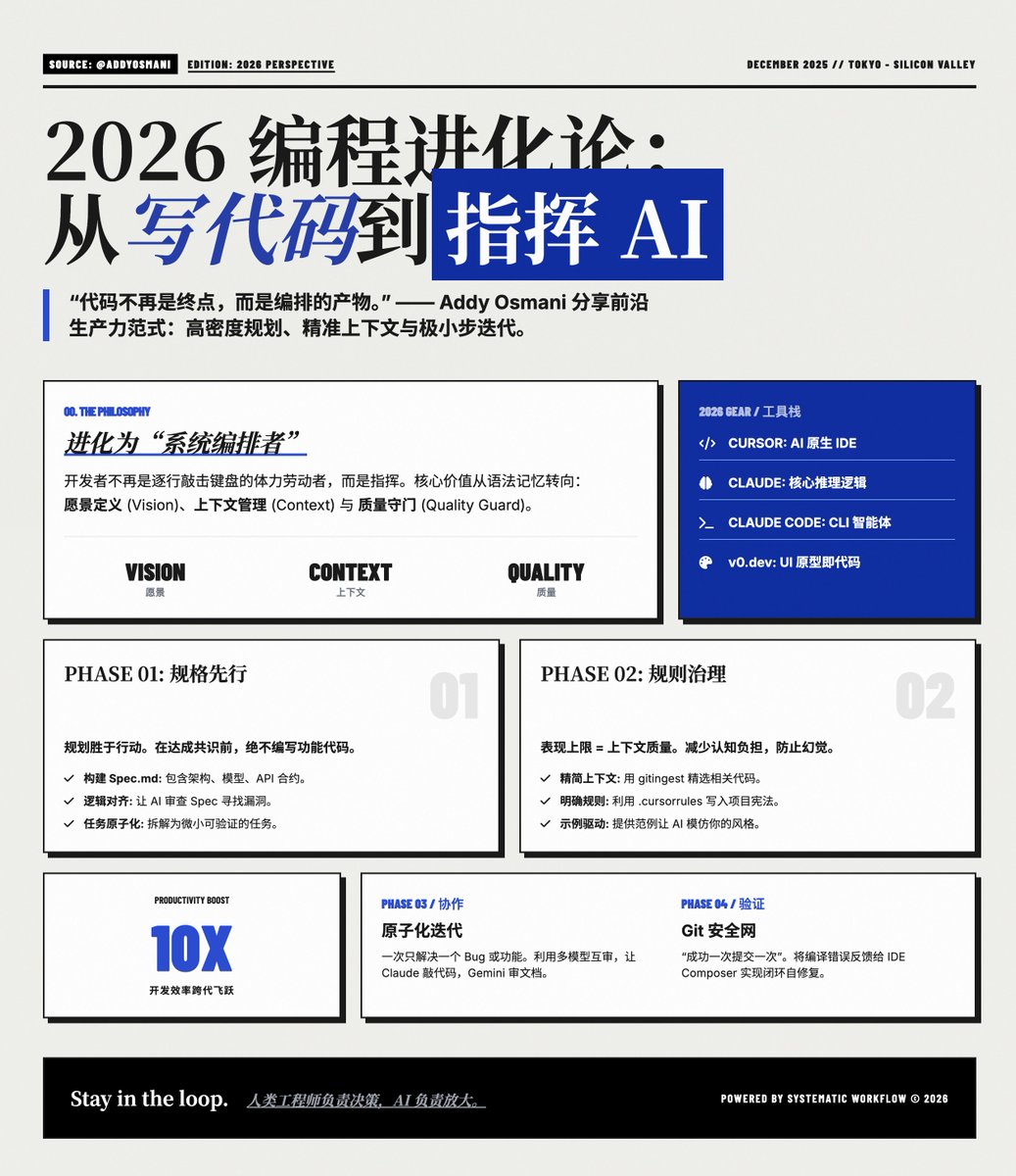 邁向2026:建構以LLM 為核心的系統化協作程式設計工作流程 @addyosmani 分享他最新的工作流程,也代表了當下最前沿的生產力範式:高密度的規劃+ 精準的上下文提供+ 極小步長的迭代驗證。 核心哲學:從“代碼編撰者”進化為“系統編排者” Addy Osmani 強調,2025 年的程式核心已經從「如何寫程式」轉向了「如何引導AI 寫程式」。開發者不再是逐行敲擊鍵盤的體力勞動者,而是擔任指揮或首席架構師的角色。 你的核心價值不再體現在對文法細節的記憶,而是: · 願景定義:清楚描述產品邏輯和架構。 · 情境管理:為AI 提供精確的資訊邊界。 · 品質守門員:對AI 生成的內容進行嚴格的邏輯審查和責任共擔。 第一階段:規格先行,規劃勝於行動在動手編碼之前,必須先與AI 達成深度對齊。 · 建構Spec 文件:建立一個spec. md 檔案。這不僅僅是需求,它應包含技術架構、資料模型、API 合約以及測試策略。 · 邏輯對齊:讓AI 檢視你的Spec,尋找邏輯矛盾或潛在的技術風險。在達成共識之前,絕不開始編寫功能程式碼。 · 任務原子化:將宏大的項目拆解為一系列微小的、可獨立驗證的「原子任務」。 第二階段:精準的脈絡與規則治理 AI 的表現上限取決於你提供資訊的品質。 · 精簡上下文:避免整個專案盲目丟給AI。使用工具(如gitingest)精準挑選與當前任務相關的程式碼和文檔,減少AI 的「認知負擔」和幻覺。 · 明確規則:透過.cursorrules 或CLAUDE. md 設定專案全域規則。例如:定義程式碼風格(如「一律使用Tailwind」)、強制要求類型安全性、或指定特定的目錄結構。 · 範例驅動:給AI 一個高品質的程式碼範例,它模仿你風格的能力遠強於它憑空創造的能力。 第三階段:原子化迭代與多模型協作執行過程中遵循「小步快跑」的節奏。 · 一次一事:每次只讓AI 完成一個特定功能或修復一個Bug。任務越小,AI 的準確度越高。 · UI 自動化:利用v0. dev 等工具透過截圖或描述直接產生前端原型,避免在佈局細節上浪費時間。 · 多模型驗證:利用不同模型的專長。例如,使用Claude 進行邏輯編寫,用Gemini 處理超長文件理解,或讓一個模型Review 另一個模型的程式碼。 第四階段:強化驗證與Git 安全網將AI 的產出視為「待審核的初級開發人員輸出」。 · Git 作為生命線:養成「成功一次就提交」的習慣。每完成一個小任務並驗證通過後,立即提交。這樣在AI 邏輯跑偏時,你可以瞬間回滾到安全狀態。 · 回饋閉環:利用IDE 的Composer 功能,將編譯報錯、Linter 警告或測試失敗訊息直接回饋給AI,讓其自我迭代修復。 · 嚴苛審查:開發者必須逐行閱讀程式碼。專注於安全性、效能邊緣案例以及AI 容易忽略的業務邏輯深度。 2026 核心工具堆疊建議🛠️ · IDE:Cursor。目前公認的AI 原生編輯器天花板,其Composer 模式支援跨文件協同編輯。 · 核心模型:Claude。在程式邏輯推理和指令遵循方面目前處於領先地位。 · 命令列智能體:Claude Code 或Copilot CLI。用於快速執行終端任務、執行測試或管理Git。 · 原型產生:v0. dev。大幅加速了從UI 設計到React 程式碼的轉換過程。 原文位址