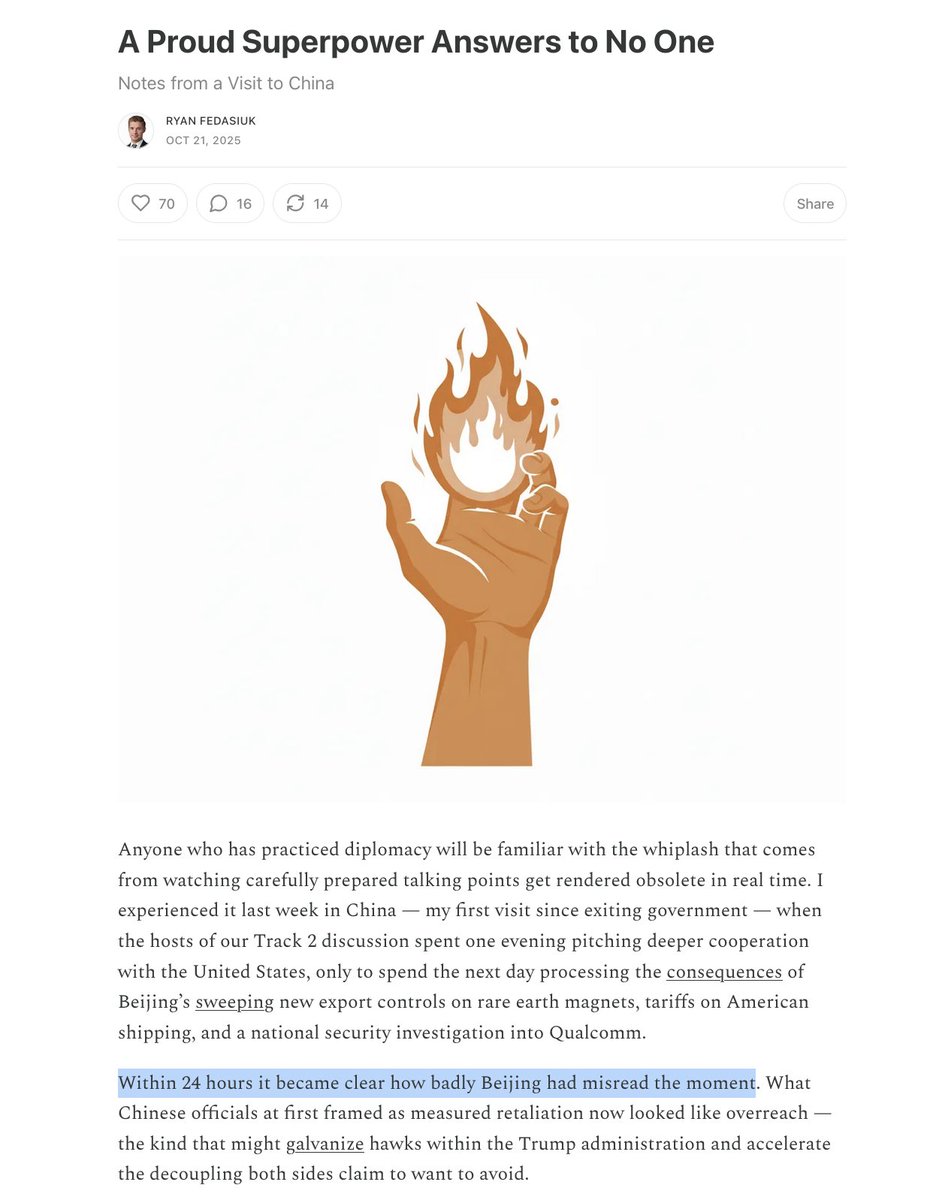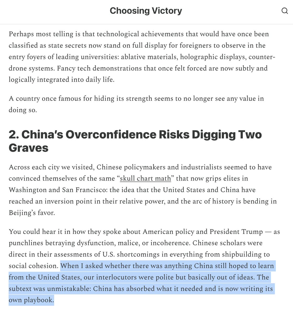 这篇文章很有意思,对于一个“对华鹰派”来说,难得地客观公正,而且也很有启发意义。回过头来看,北京当时真的误判了什么吗?如果没有,那么究竟是谁应该向谁学习呢?看看如今各国争相出台的产业政策、Nexperia、H200s……我不禁思考。