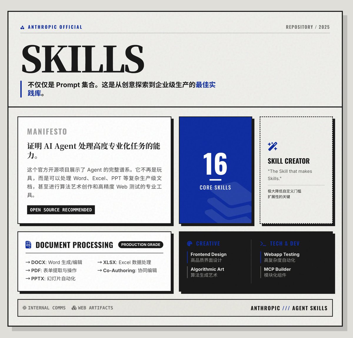 [開源推薦] Skills: Anthropic 官方Agent Skills 精選資源和最佳實踐庫 Anthropic 官方開源的這個計畫展示了從創意到企業級的完整譜系,證明Skills 系統能處理高度專業化的重複任務。目前倉庫中共包含16 個技能,分為幾個主要類別🔽 1. 文檔處理類別(最複雜、生產級) · docx:處理Microsoft Word 文件產生/編輯· pdf:PDF 文件操作(如表單欄位擷取、影像處理) · pptx:PowerPoint 投影片產生/編輯· xlsx:Excel 表格處理· doc-coauthoring:文件協同編輯 2. 創意與設計類· algorithmic-art:演算法生成藝術· canvas-design:畫布式視覺設計(如海報、藝術品) · frontend-design:前端介面高品質設計(最近更新) · theme-factory:主題生成· brand-guidelines:品牌指南應用 3. 開發與技術類· webapp-testing:Web 應用自動化測試(複雜度高) · web-artifacts-builder:Web 元件建構· mcp-builder:模組化元件建構 4. 企業與溝通類別· internal-comms:內部溝通工作流程· slack-gif-creator:Slack GIF 生成 5. 元技能· skill-creator:幫助創建新技能的“技能生成器”,極大降低自定義門檻,是擴展性的關鍵體現 開源位址