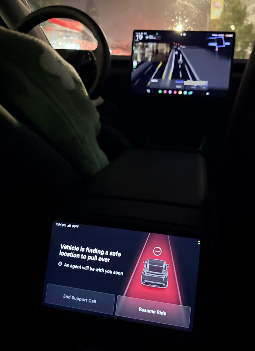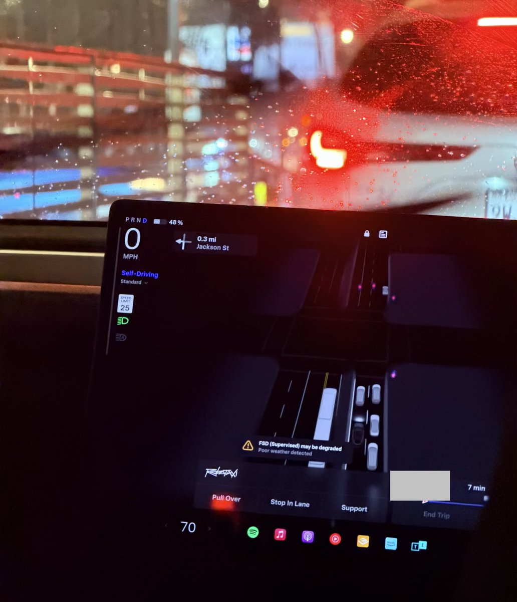 我的@Robotaxi多次尝试取消行程并靠边停车。 看来它不太喜欢旧金山的雨——仪表盘显示: FSD(监督式)可能会降级 检测到恶劣天气
