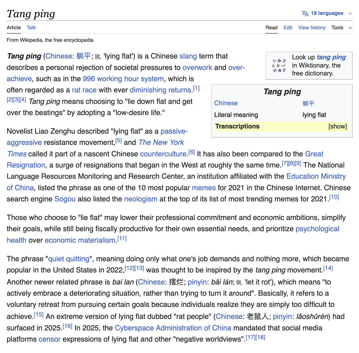 有趣的是,没人能正确理解“平躺”这个词的含义。西方人可能嗑了药,但中国人写的也是胡言乱语。我觉得他们是不敢把意思说清楚。 在现代中国,你可以平躺着。只要你不努力奋斗,就不会挨饿。