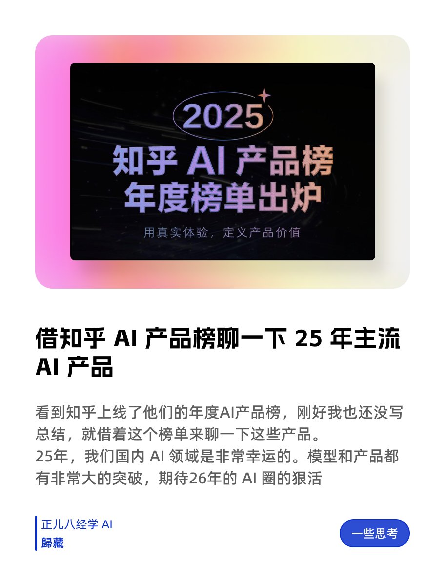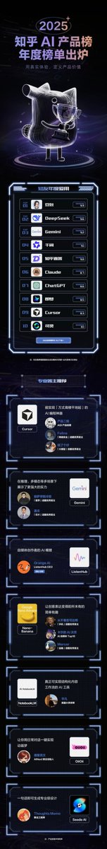 看到知乎上線了他們的年度AI產品榜,剛好我也還沒寫總結,就藉著這個榜單來聊一下這些產品。 首先國內通用聊天產品,豆包排第一,第二是Deepseek,後面有千問和知乎直答。 今年國內所有的廠商基本上都吃的是Deepseek在年初爆發的紅利。我們用整整一年的時間,把這部分用戶從完全不了解AI拉到了每天使用AI。 在做產品上字節是厲害的。不管是能力還是產品策略、營運策略、推廣方法,都展現了自己在做產品上應有的戰鬥力。由於語音模式的低門檻,讓許多小朋友和老人都能夠非常順暢地使用豆包。非圈內的用戶一說就是豆包和Deepseek,這就是他們理解的AI。 千問的成長也很迅猛,阿里在年底終於搭建了他們的模型系統和新的團隊,開始瘋狂發力。最近有不少人一提起AI,就會提到千問了 然後是海外的ChatBot產品,Claude、ChatGPT和Gemini Gemini排得相當靠前。谷歌在年底的這一波發布還是太猛了,又有錢,又有卡,又有人,模型還強。低成本提供最優質的模型,是這個產業現在最強的推廣手段,也是最穩定的 Anthropic 在今年也確定了自己的發展方向,在產品的人力和資源投入上,維持較低的水準。但透過Claude Code這種對開發的依賴比較低,又能發揮模型能力的產品,快速地搶佔使用者心智和市場。尤其在程式領域,非常難以撼動,2B的收入很高 Sam 最近確實不是很好過。自從GPT-5發布以來,大家對於OpenAI的模型就一直沒有什麼好的評價,尤其是在模型的語言風格和回應策略上。但在產品層面,ChatGPT確實是最好的。這也是為什麼它的用戶忠誠度比較高的原因 然後就是即夢和可靈兩個內容創作工具,國內今年在圖像和視頻領域基本上是相較於海外一騎絕塵的。但是年底Nano Banana Pro發布、Sora2發布以後,直接將圖像和視頻模型帶到了一個新的領域。針對於視覺推理以及編輯能力,我們需要盡快趕上 最後是Cursor,基本上開啟了今年的Agent大幕。在Agent這一塊的創新,包括上下文工程、底層多個模型的混合調用,以及關於Agent的操作的基本交互邏輯,都為許多AI產品指明了方向。卡帕西的年終總結也非常著重地提到了Cursor以及vibe Coding 25年,我們AI領域是非常幸運的。模型和產品都有非常大的突破,期待26年的AI 圈還有什麼狠活