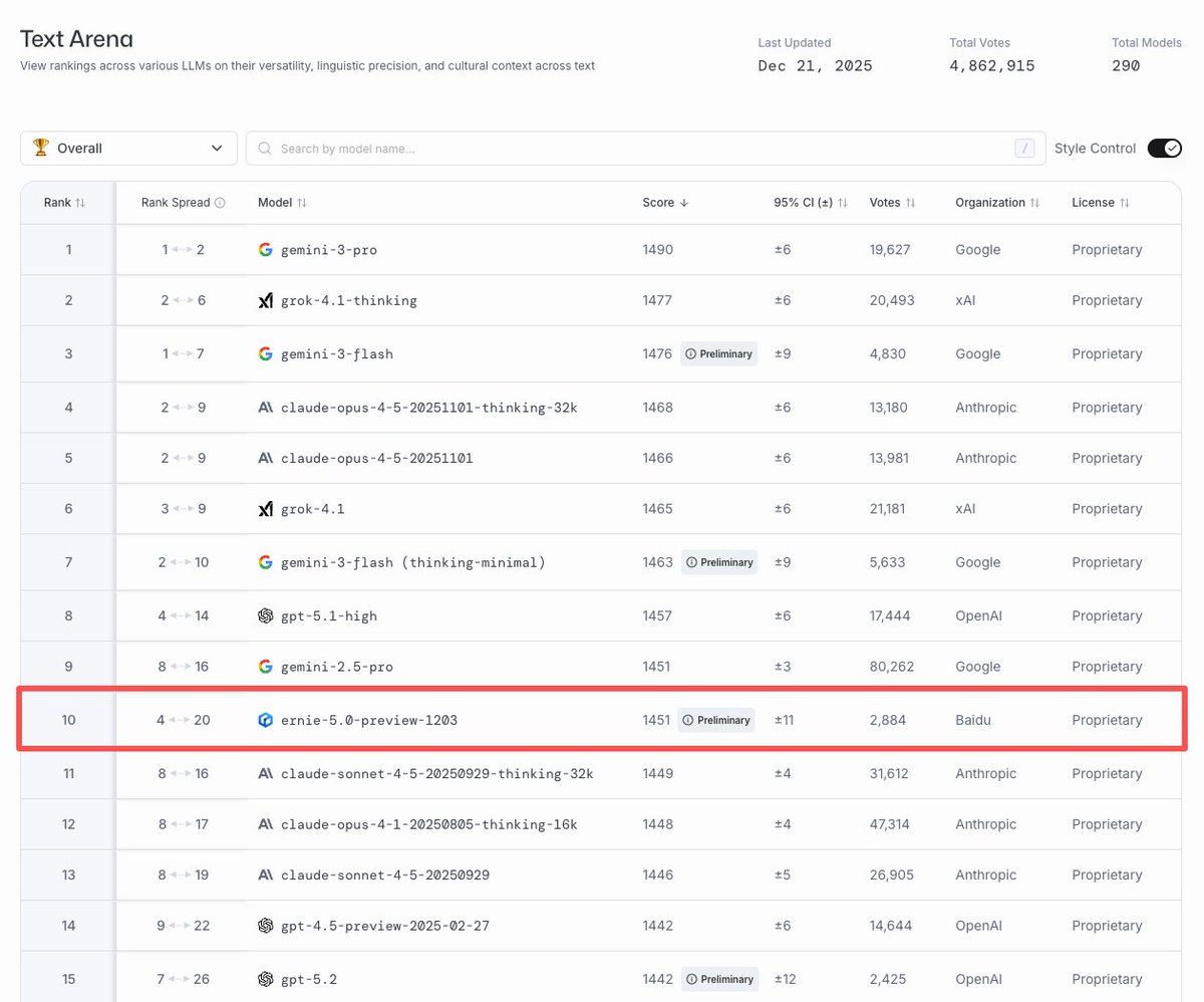 最近一直有不少文心的消息傳出。 剛刷到LMArena 文字排名,意外發現又放出了個預覽版ERNIE-5.0-Preview-1203。 還衝進了全球前十,成了前20 裡唯一的國產模型,看來百度一直默默低調。 聽說正式版將會在1 月發售。現在預覽版都這麼強了,屆時正式版又會衝到第幾名? 越發有點期待了,我這邊將會繼續留意訊息,待正式版發布後,抽空為大家實測看看。