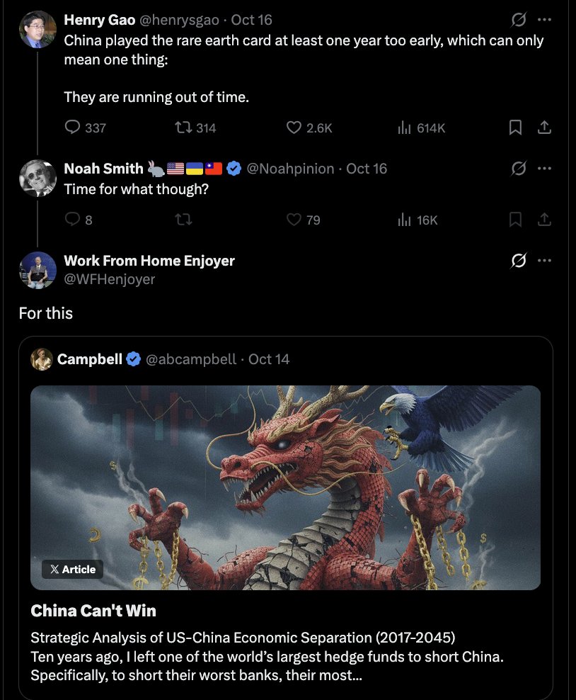 我一直在找这个。这里有一位对“习近平误判”这一观点颇有研究的分析家。还记得那段日子吗?当时人们争论稀土出口管制究竟是国家安全部擅自行动,还是习近平主席一时糊涂? 这次我们该相信他吗,孩子们?